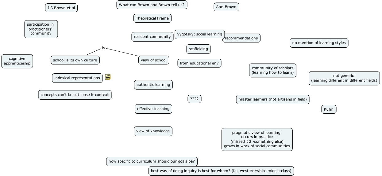 ed 750 class mtg map 3-17-04, school is its own culture, authentic learning, recommendations, indexical representations, best way of doing inquiry is best for whom? (i.e. western white middle-class), community of scholars (learning how to learn), resident community, ????, from educational env, ann brown, no mention of learning styles, scaffolding, concepts can't be cut loose fr context, cognitive apprenticeship, view of knowledge, participation in practitioners' community, what can brown and brown tell us?, view of school, theoretical frame, effective teaching, not generic (learning different in different fields), master learners (not artisans in field), how specific to curriculum should our goals be?, pragmatic view of learning occurs in practice (missed 2 -something else) grows in work of social communities, kuhn, j s brown et al, vygotsky social learning