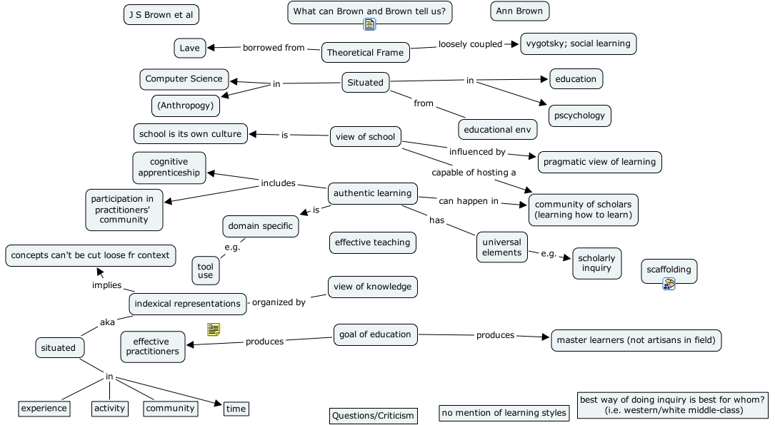 ed 750 3-17-04 2, goal of education, concepts can't be cut loose fr context, view of school, (anthropogy), activity, effective teaching, questions criticism, scholarly inquiry, theoretical frame, effective practitioners, education, tool use, view of knowledge, no mention of learning styles, participation in practitioners' community, community, time, situated, computer science, school is its own culture, best way of doing inquiry is best for whom? (i.e. western white middle-class), universal elements, what can brown and brown tell us?, pscychology, j s brown et al, educational env, lave, indexical representations, master learners (not artisans in field), authentic learning, cognitive apprenticeship, domain specific, scaffolding, experience, ann brown, situated , pragmatic view of learning, vygotsky social learning, community of scholars (learning how to learn)