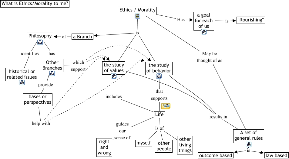 Ethics 040307 edited, Other Branches provide bases or perspectives, the study of values includes Life, bases or perspectives help with the study of behavior, Other Branches which support the study of values, Life guides our sense of right and wrong, the study of behavior results in A set of general rules, Ethics / Morality Has a goal for each of us, Ethics / Morality May be thought of as A set of general rules, Philosophy identifies historical or related issues, Life is of myself