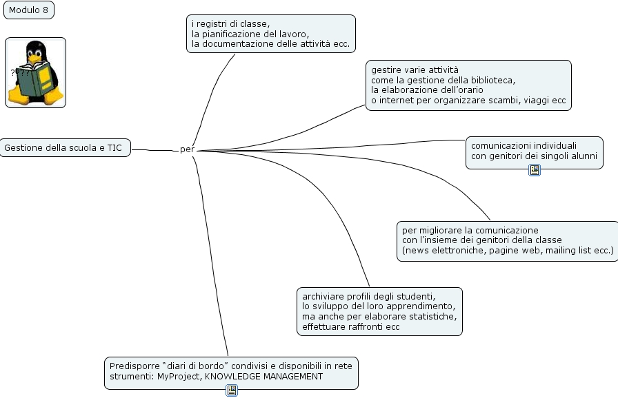 m8, i registri di classe, la pianificazione del lavoro, la documentazione delle attivit� ecc., archiviare profili degli studenti, lo sviluppo del loro apprendimento, ma anche per elaborare statistiche, effettuare raffronti ecc, ????, per migliorare la comunicazione con l�insieme dei genitori della classe (news elettroniche, pagine web, mailing list ecc.), gestione della scuola e tic , predisporre �diari di bordo� condivisi e disponibili in rete strumenti myproject, knowledge management , comunicazioni individuali con genitori dei singoli alunni, gestire varie attivit� come la gestione della biblioteca, la elaborazione dell�orario o internet per organizzare scambi, viaggi ecc, modulo 8