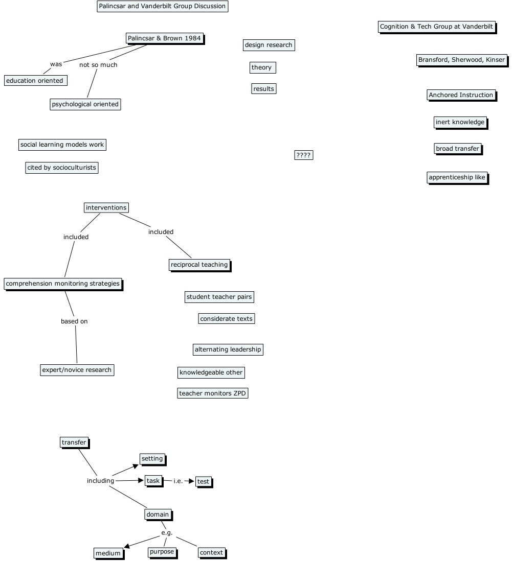 ed 750 3-24-04, broad transfer, context, cited by socioculturists, apprenticeship like, inert knowledge, considerate texts, medium, domain, palincsar and vanderbilt group discussion, palincsar & brown 1984, psychological oriented, anchored instruction, cognition & tech group at vanderbilt, purpose, theory , design research, education oriented , expert novice research, interventions, results, comprehension monitoring strategies, test, task, setting, social learning models work, bransford, sherwood, kinser, transfer, student teacher pairs, knowledgeable other, teacher monitors zpd, alternating leadership, reciprocal teaching, ????
