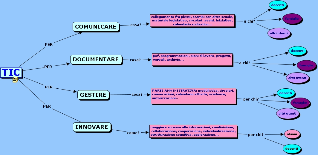 tic e scuola, comunicare, docenti, alunni, innovare, docenti, parte amministrativa modulistica, circolari, convocazioni, calendario attivit�, scadenze, autorizzazioni.. , documentare, maggiore accesso alle informazioni, condivisione, collaborazione, cooperazione, individualizzazione, strutturazione cognitiva, esplorazione..., gestire, altri utenti, docenti, tic, famiglie, altri utenti, collegamento fra plessi, scambi con altre scuole, materiale legislativo, circolari, avvisi, iniziative, calendario scolastico..., famiglie, pof, programmazioni, piani di lavoro, progetti, verbali, archivio... , altri utenti, famiglie, docenti