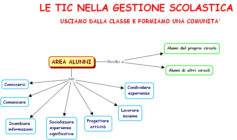 tic x gli alunni, le tic nella gestione scolastica, area alunni, alunni del proprio circolo, conoscersi, lavorare insieme, progettare attivit�, scambiare informazioni, socializzare esperienze significative, condividere esperienze, usciamo dalla classe e formiamo una comunita', alunni di altri circoli, comunicare