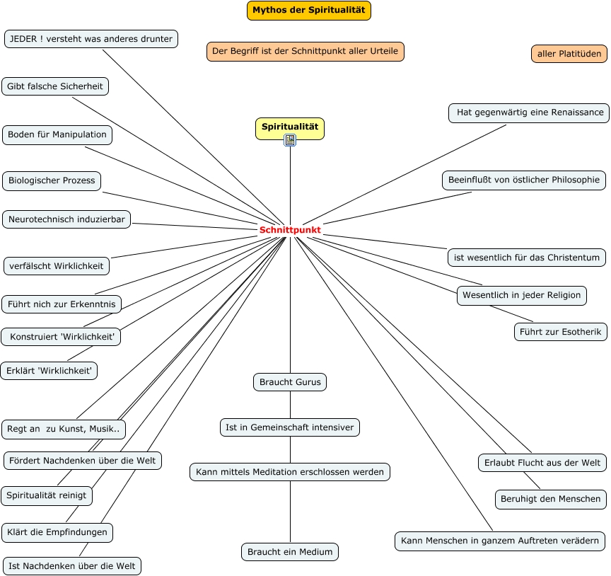 Dieses mit IHMC CmapTools erstellte CMap hat Informationen bezüglich: Spiritualitaet, Spiritualität Schnittpunkt verfälscht Wirklichkeit, Spiritualität Schnittpunkt Erklärt 'Wirklichkeit', Spiritualität Schnittpunkt Wesentlich in jeder Religion, Spiritualität Schnittpunkt Kann mittels Meditation erschlossen werden, Spiritualität Schnittpunkt Führt nich zur Erkenntnis, Spiritualität Schnittpunkt Beeinflußt von östlicher Philosophie, Spiritualität Schnittpunkt Hat gegenwärtig eine Renaissance, Spiritualität Schnittpunkt Konstruiert 'Wirklichkeit', Spiritualität Schnittpunkt Ist Nachdenken über die Welt, Spiritualität Schnittpunkt Erlaubt Flucht aus der Welt, Spiritualität Schnittpunkt Gibt falsche Sicherheit, Spiritualität Schnittpunkt Neurotechnisch induzierbar, Spiritualität Schnittpunkt Biologischer Prozess, Spiritualität Schnittpunkt Boden für Manipulation, Spiritualität Schnittpunkt Beruhigt den Menschen, Spiritualität Schnittpunkt Kann Menschen in ganzem Auftreten verädern, Spiritualität Schnittpunkt JEDER ! versteht was anderes drunter, Spiritualität Schnittpunkt Braucht Gurus, Spiritualität Schnittpunkt ist wesentlich für das Christentum, Spiritualität Schnittpunkt Braucht ein Medium