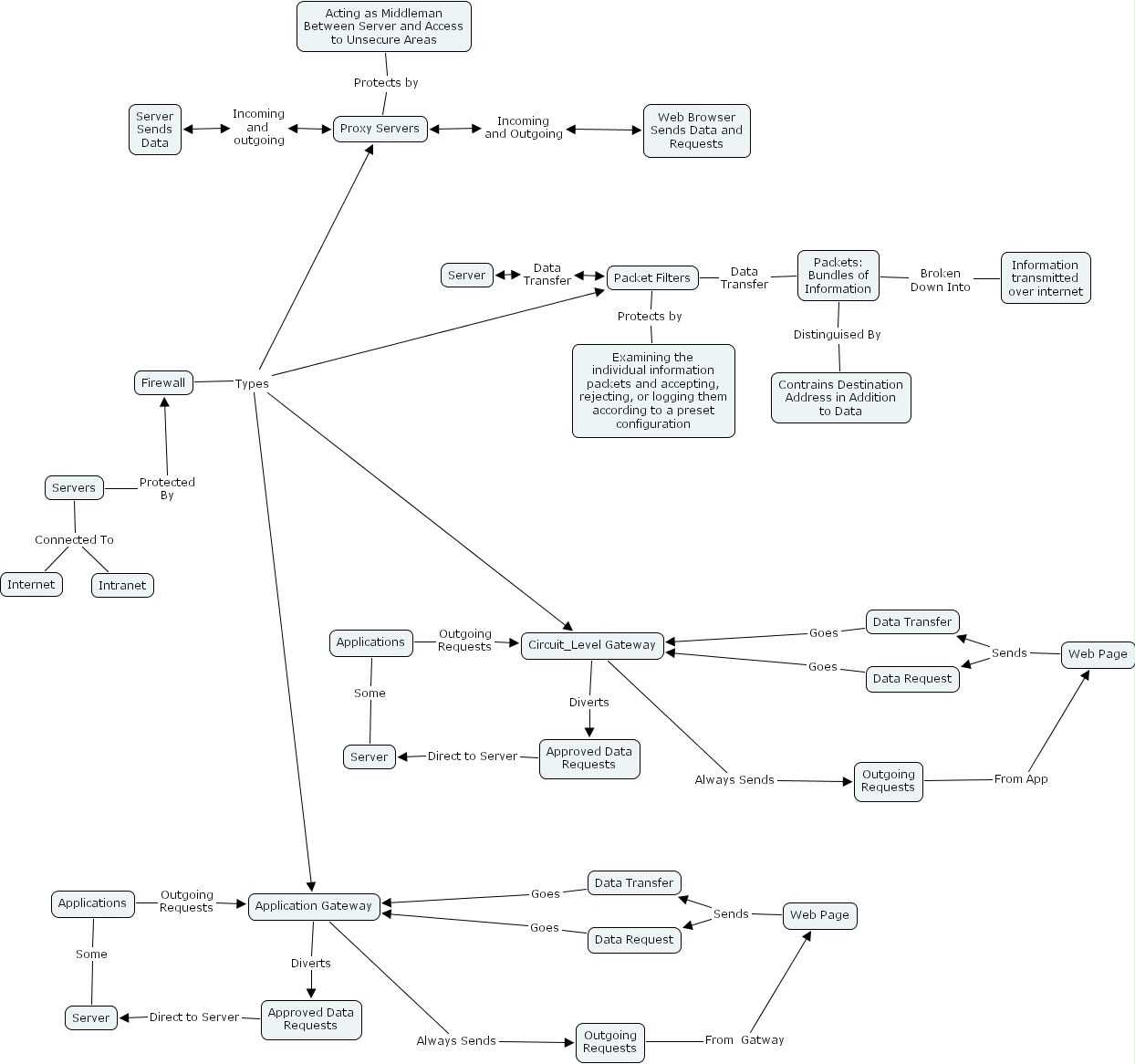 firewalls, information transmitted over internet, contrains destination address in addition to data, servers, server, server, web browser sends data and requests, applications, approved data requests, internet, outgoing requests, data request, packet filters, application gateway, proxy servers, circuit level gateway, data transfer, packets bundles of information, approved data requests, examining the individual information packets and accepting, rejecting, or logging them according to a preset configuration, data request, data transfer, server sends data, web page, server, intranet, web page, applications, acting as middleman between server and access to unsecure areas, firewall, outgoing requests