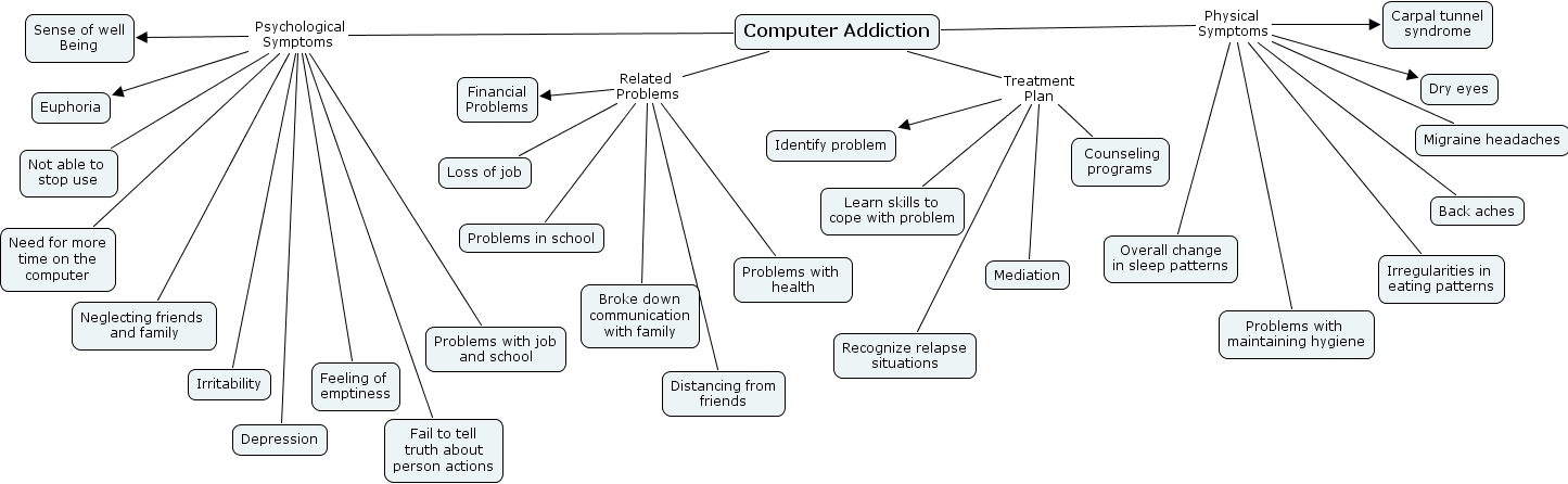 computeraddiction, counseling programs, carpal tunnel syndrome, dry eyes, problems in school, financial problems, broke down communication with family, need for more time on the computer, back aches, problems with job and school, problems with maintaining hygiene, irritability, computer addiction, fail to tell truth about person actions, distancing from friends, euphoria, migraine headaches, irregularities in eating patterns, overall change in sleep patterns, feeling of emptiness, mediation, loss of job, sense of well being, problems with health, not able to stop use, identify problem, depression, neglecting friends and family, learn skills to cope with problem, recognize relapse situations