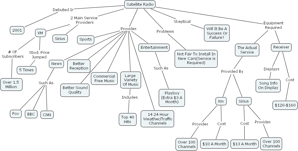 news report cmap, will it be a success or failure?, xm, bbc, $13 a month, $10 a month, satellite radio, song info on display, sirius, receiver, cnn, fox, over 100 channels, news, 14 24 hour weather traffic channels, xm, the actual service, playboy (extra $3 a month), not fair to install in new cars(service is required), entertainment, sirius, sports, 2001, large variety of music, better reception, 5 times, over 100 channels, $120-$160, over 1.5 million, better sound quality, commercial free music, top 40 hits