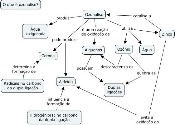 Esse mapa conceitual, produzido no IHMC CmapTools, tem a informação relacionada a: OZONÓLISE 3C DEMAIS, Ozonólise pode produzir Cetona, Zinco evita a oxidação do Aldeído, Alquenos possuem Duplas ligações, Ozonólise pode produzir Aldeído, Ozônio quebra as Duplas ligações, Ozonólise utiliza Água, Ozonólise produz Água oxigenada, Hidrogênio(s) no carbono da dupla ligação influencia a formação de Aldeído, Ozônio descaracteriza os Alquenos, Ozonólise é uma reação de oxidação de Alquenos, Ozonólise utiliza Ozônio, Ozonólise utiliza Zinco, Zinco catalisa a Ozonólise, Radicais no carbono da dupla ligação determina a formação de Cetona