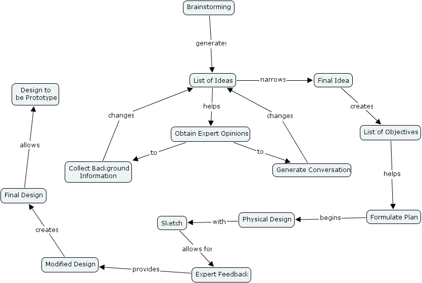 cmap13, list of objectives, physical design, final design, expert feedback, design to be prototype, generate conversation, obtain expert opinions, collect background information, list of ideas, modified design, brainstorming, sketch, formulate plan, final idea