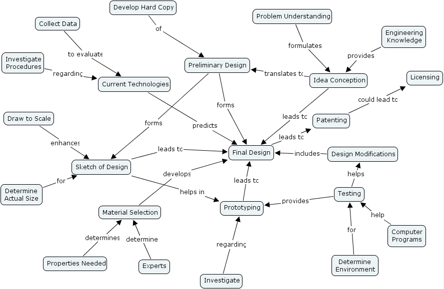 cmap 15, determine environment, investigate procedures, determine actual size, investigate, computer programs, prototyping, develop hard copy, collect data, testing, final design, engineering knowledge, draw to scale, idea conception, design modifications, sketch of design, patenting, properties needed, licensing, current technologies, problem understanding, material selection, experts, preliminary design