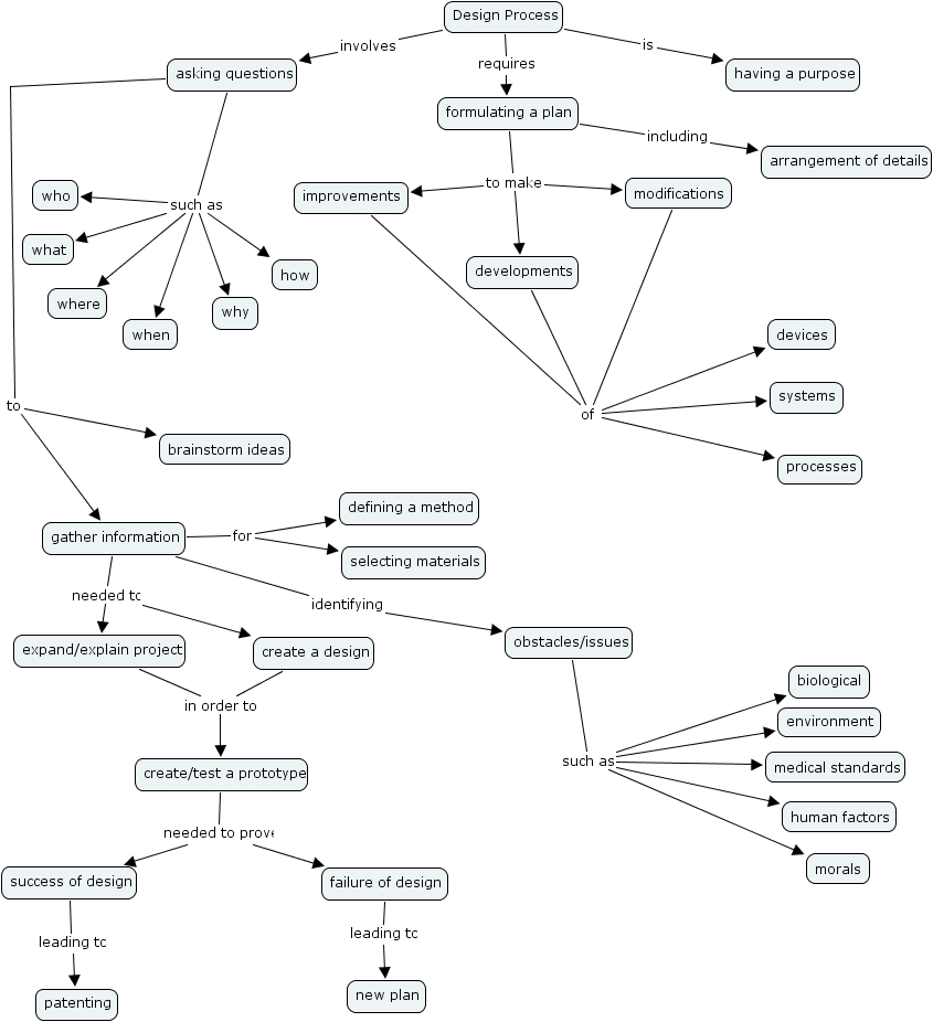 cmap 16, defining a method, expand explain project, modifications, why, formulating a plan, morals, brainstorm ideas, when, design process, processes, new plan, what, create a design, patenting, environment, improvements, who, how, failure of design, biological, create test a prototype, having a purpose, arrangement of details, asking questions, selecting materials, systems, gather information, success of design, medical standards, developments, where, devices, obstacles issues, human factors