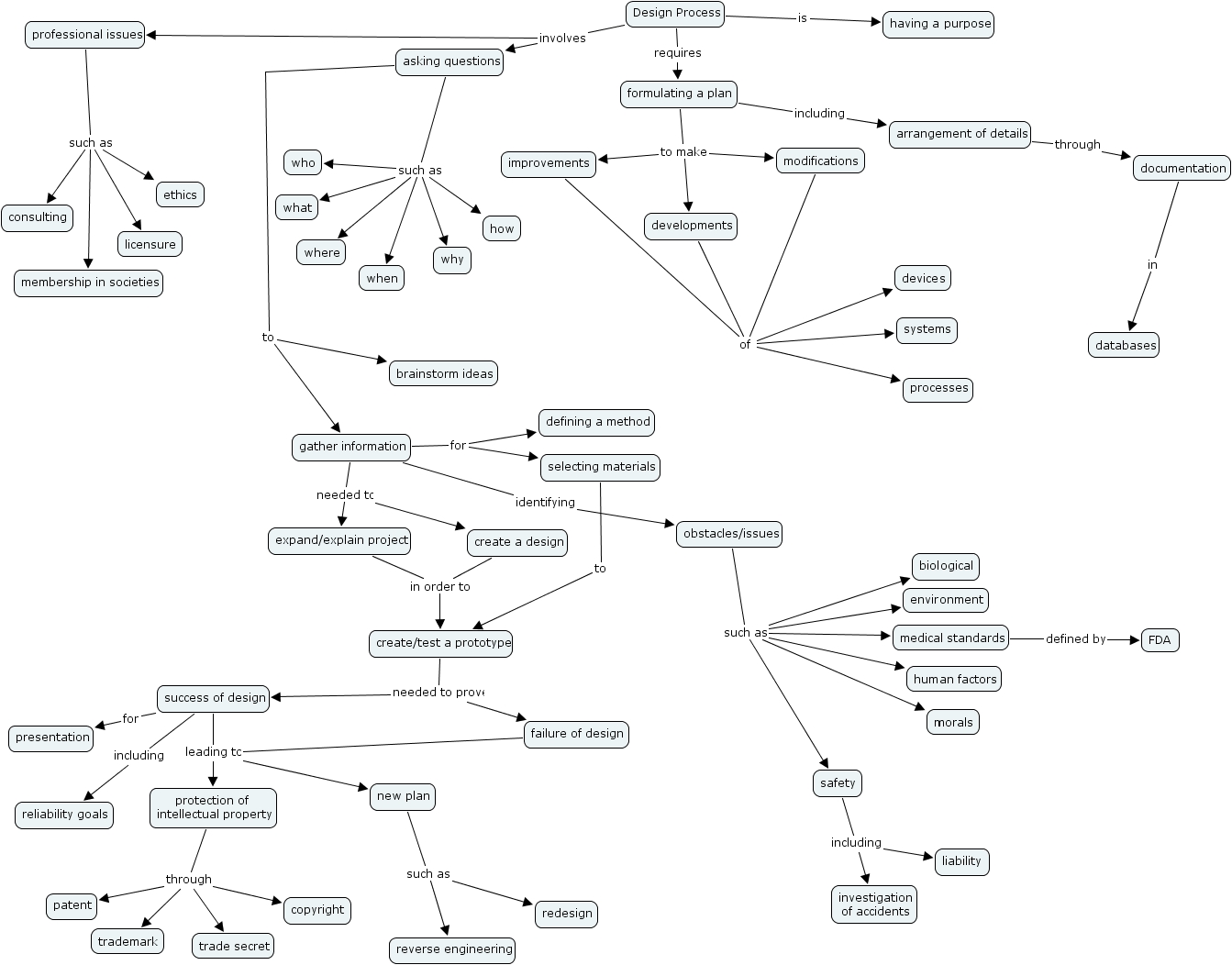 cmap 17, consulting, professional issues, databases, licensure, expand explain project, morals, improvements, copyright, who, processes, human factors, having a purpose, liability, new plan, obstacles issues, when, developments, systems, investigation of accidents, membership in societies, defining a method, arrangement of details, design process, fda, modifications, patent, safety, documentation, asking questions, environment, redesign, why, ethics, devices, success of design, create a design, reliability goals, how, reverse engineering, failure of design, biological, trademark, where, formulating a plan, create test a prototype, trade secret, presentation, what, medical standards, gather information, brainstorm ideas, selecting materials, protection of intellectual property