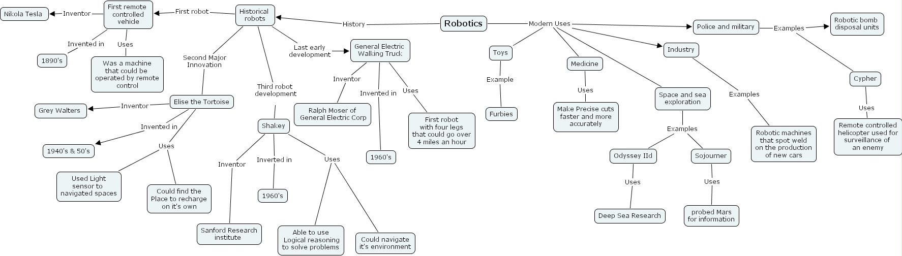 robots, could find the place to recharge on it's own, sojourner, robotic bomb disposal units, general electric walking truck, probed mars for information, deep sea research, grey walters , ralph moser of general electric corp, police and military, able to use logical reasoning to solve problems, make precise cuts faster and more accurately, cypher, nikola tesla , sanford research institute , shakey, could navigate it's environment, robotics, 1960's, historical robots, odyssey iid, toys, 1940's & 50's, used light sensor to navigated spaces, first robot with four legs that could go over 4 miles an hour, was a machine that could be operated by remote control, robotic machines that spot weld on the production of new cars, furbies, medicine, 1890's, 1960's, space and sea exploration, first remote controlled vehicle, remote controlled helicopter used for surveillance of an enemy, industry, elise the tortoise