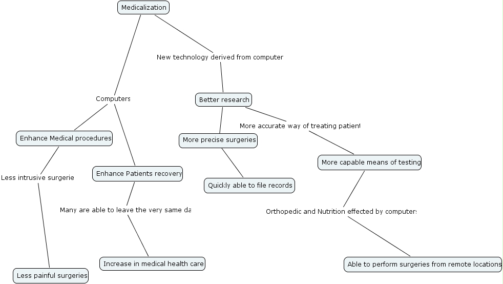 medical, enhance patients recovery, enhance medical procedures, increase in medical health care, more precise surgeries, able to perform surgeries from remote locations, less painful surgeries, quickly able to file records, medicalization, more capable means of testing, better research