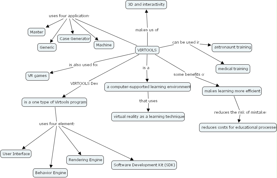 virtools cmap, software development kit (sdk), 3d and interactivity, rendering engine, reduces costs for educational processes, is a one type of virtools program, virtual reality as a learning technique, astronaunt training, makes learning more efficient, medical training, virtools, machine, behavior engine, generic, a computer-supported learning environment, case generator, vr games, master, user interface