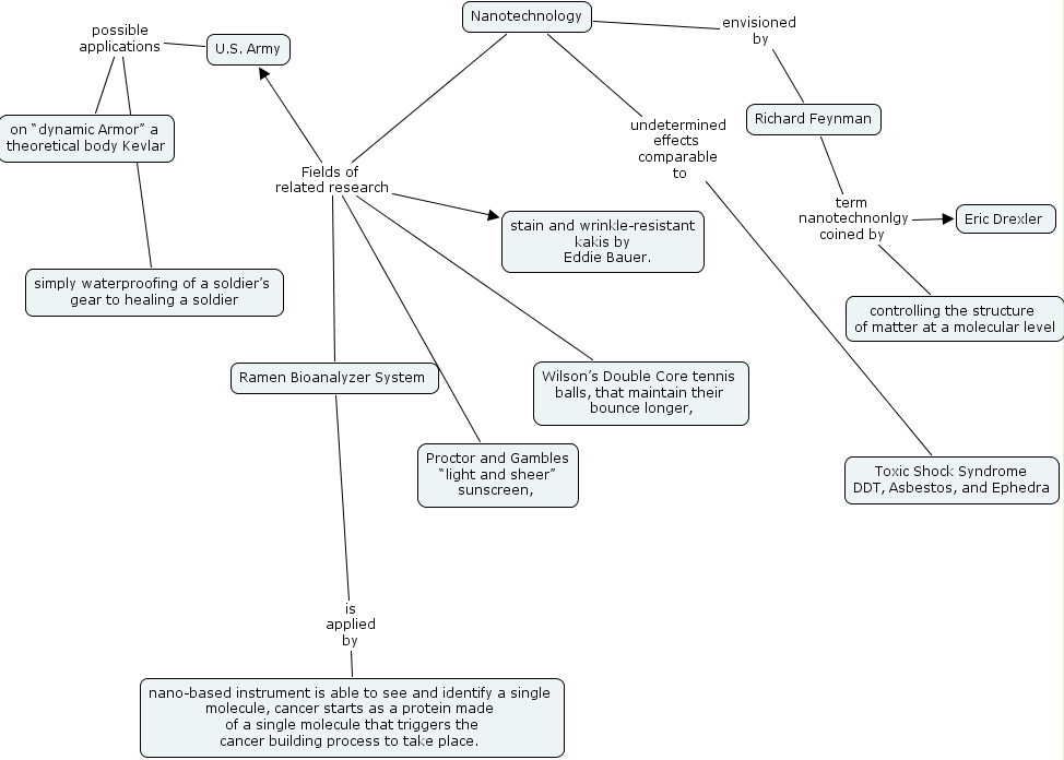 untitled 1, richard feynman, on �dynamic armor� a theoretical body kevlar, nanotechnology, nano-based instrument is able to see and identify a single molecule, cancer starts as a protein made of a single molecule that triggers the cancer building process to take place. , wilson�s double core tennis balls, that maintain their bounce longer,, ramen bioanalyzer system , stain and wrinkle-resistant kakis by eddie bauer. , simply waterproofing of a soldier�s gear to healing a soldier, proctor and gambles �light and sheer� sunscreen, , eric drexler , u.s. army, toxic shock syndrome ddt, asbestos, and ephedra, controlling the structure of matter at a molecular level