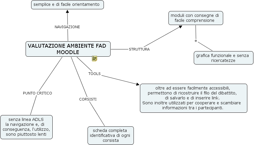 valutazione moodle, semplice e di facile orientamento, senza linea adls la navigazione e, di conseguenza, l'utilizzo, sono piuttosto lenti , scheda completa identificativa di ogni corsista, valutazione ambiente fad moodle, grafica funzionale e senza ricercatezze, moduli con consegne di facile comprensione , oltre ad essere facilmente accessibili, permettono di ricostruire il filo del dibattito, di salvarlo e di inserire link. sono inoltre utilizzati per cooperare e scambiare informazioni tra i partecipanti.