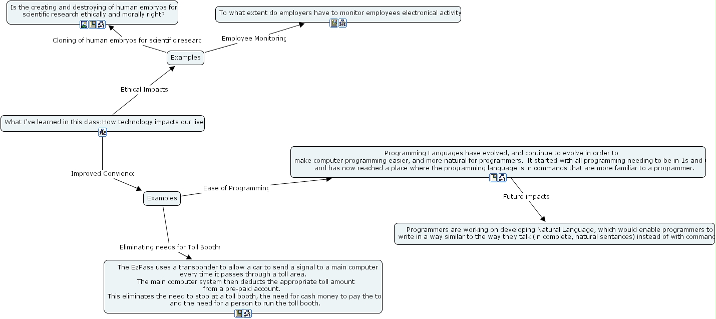 summery, programmers are working on developing natural language, which would enable programmers to write in a way similar to the way they talk (in complete, natural sentances) instead of with commands., programming languages have evolved, and continue to evolve in order to make computer programming easier, and more natural for programmers. it started with all programming needing to be in 1s and 0s, and has now reached a place where the programming language is in commands that are more familiar to a programmer., what i've learned in this class how technology impacts our lives, examples, to what extent do employers have to monitor employees electronical activity?, the ezpass uses a transponder to allow a car to send a signal to a main computer every time it passes through a toll area. the main computer system then deducts the appropriate toll amount from a pre-paid account. this eliminates the need to stop at a toll booth, the need for cash money to pay the toll, and the need for a person to run the toll booth. , examples, is the creating and destroying of human embryos for scientific research ethically and morally right?