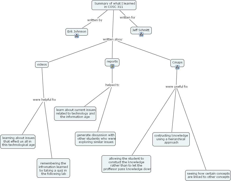 summary report, costructing knowledge using a heirarchical approach, learn about current issues related to technology and the information age , jeff schmitt, erik johnson, seeing how certain concepts are linked to other concepts, generate discussion with other students who were exploring similar issues, learning about issues that effect us all in this technological age, remembering the infromation learned by taking a quiz in the following lab, cmaps, videos, allowing the student to constuct the knowledge rather than to let the proffesor pass knowledge down, reports, summary of what i learned in cosc 311
