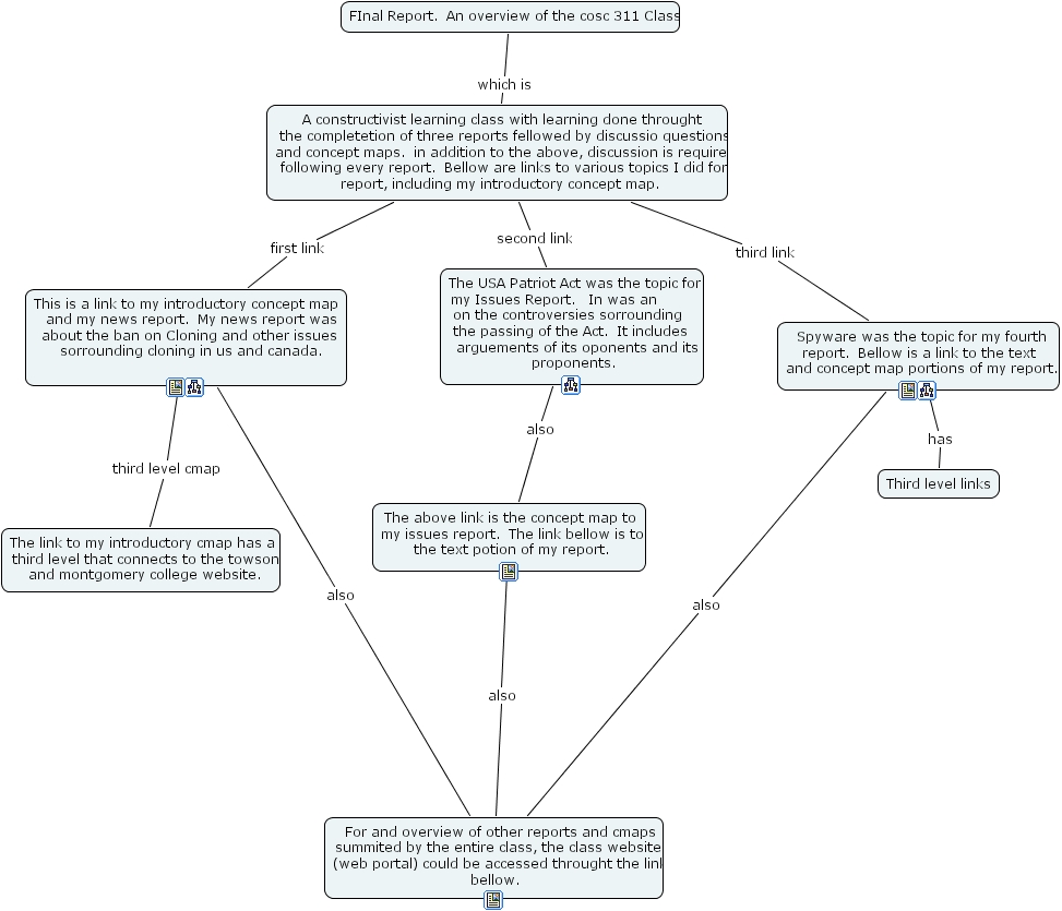 final report, for and overview of other reports and cmaps summited by the entire class, the class website (web portal) could be accessed throught the link bellow., the above link is the concept map to my issues report. the link bellow is to the text potion of my report., final report. an overview of the cosc 311 class, a constructivist learning class with learning done throught the completetion of three reports fellowed by discussio questions and concept maps. in addition to the above, discussion is required following every report. bellow are links to various topics i did for report, including my introductory concept map., the link to my introductory cmap has a third level that connects to the towson and montgomery college website., spyware was the topic for my fourth report. bellow is a link to the text and concept map portions of my report., third level links, the usa patriot act was the topic for my issues report. in was an on the controversies sorrounding the passing of the act. it includes arguements of its oponents and its proponents., this is a link to my introductory concept map and my news report. my news report was about the ban on cloning and other issues sorrounding cloning in us and canada.