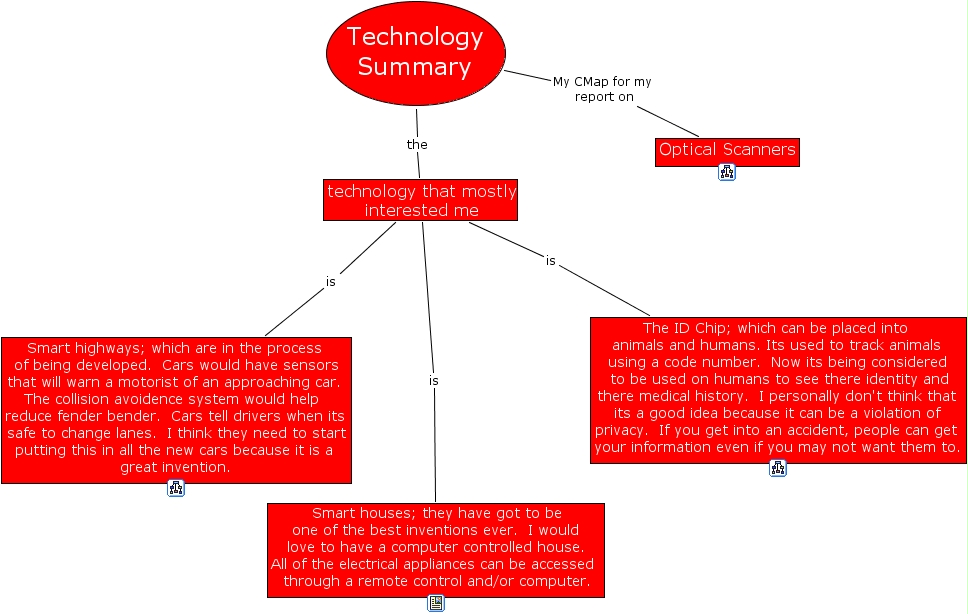 technology summary, optical scanners, the id chip which can be placed into animals and humans. its used to track animals using a code number. now its being considered to be used on humans to see there identity and there medical history. i personally don't think that its a good idea because it can be a violation of privacy. if you get into an accident, people can get your information even if you may not want them to., smart houses they have got to be one of the best inventions ever. i would love to have a computer controlled house. all of the electrical appliances can be accessed through a remote control and or computer., smart highways which are in the process of being developed. cars would have sensors that will warn a motorist of an approaching car. the collision avoidence system would help reduce fender bender. cars tell drivers when its safe to change lanes. i think they need to start putting this in all the new cars because it is a great invention., technology summary, technology that mostly interested me