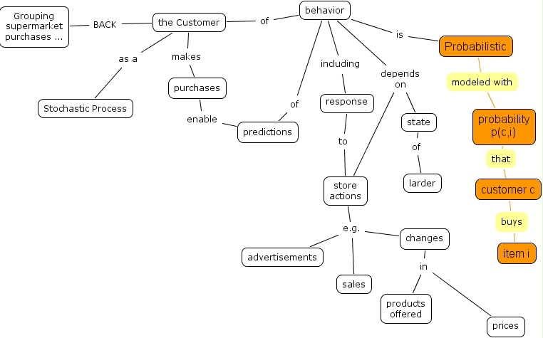 stringmapcase1, customer c, changes, response, state, probabilistic, larder, grouping supermarket purchases ..., store actions, prices, sales, products offered, probability p(c,i), purchases, behavior, item i, stochastic process, advertisements, the customer, predictions