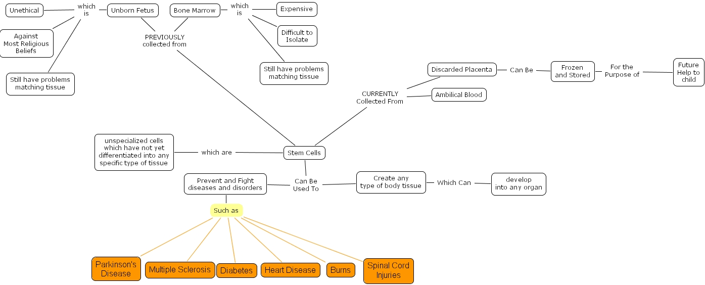 outgoingcase8, ambilical blood, against most religious beliefs, spinal cord injuries, parkinson's disease, still have problems matching tissue, develop into any organ, unspecialized cells which have not yet differentiated into any specific type of tissue, unethical, expensive, burns, future help to child, stem cells, frozen and stored, unborn fetus, still have problems matching tissue, discarded placenta, multiple sclerosis, diabetes, create any type of body tissue, heart disease, difficult to isolate, bone marrow, prevent and fight diseases and disorders