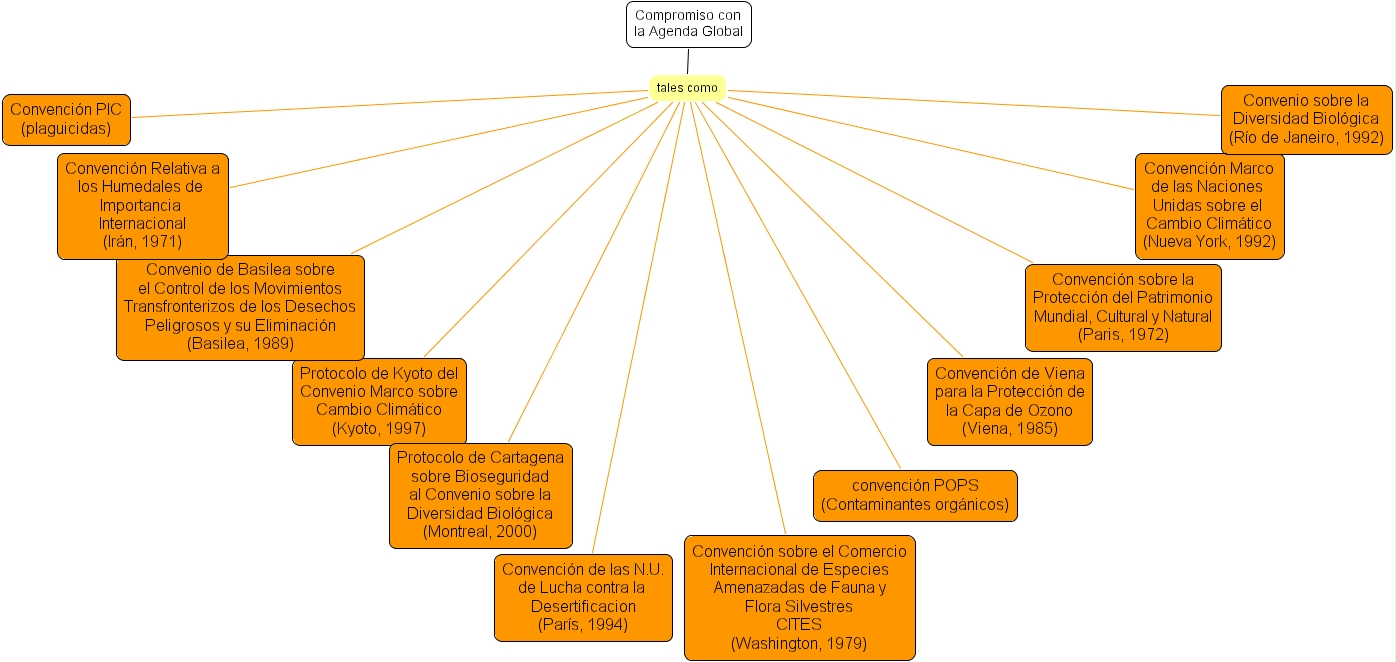 outgoingcase2, protocolo de kyoto del convenio marco sobre cambio clim�tico (kyoto, 1997), convenio de basilea sobre el control de los movimientos transfronterizos de los desechos peligrosos y su eliminaci�n (basilea, 1989), protocolo de cartagena sobre bioseguridad al convenio sobre la diversidad biol�gica (montreal, 2000), convenci�n sobre el comercio internacional de especies amenazadas de fauna y flora silvestres cites (washington, 1979), convenci�n de las n.u. de lucha contra la desertificacion (par�s, 1994), convenci�n marco de las naciones unidas sobre el cambio clim�tico (nueva york, 1992), compromiso con la agenda global, convenci�n relativa a los humedales de importancia internacional (ir�n, 1971), convenci�n sobre la protecci�n del patrimonio mundial, cultural y natural (paris, 1972), convenci�n de viena para la protecci�n de la capa de ozono (viena, 1985), convenio sobre la diversidad biol�gica (r�o de janeiro, 1992), convenci�n pic (plaguicidas), convenci�n pops (contaminantes org�nicos)