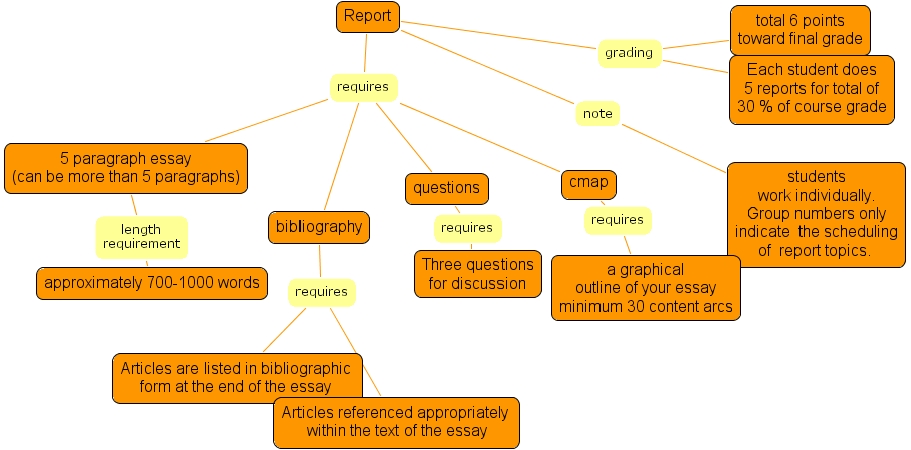 treecase21, students work individually. group numbers only indicate the scheduling of report topics. , questions, cmap, bibliography, a graphical outline of your essay minimum 30 content arcs, total 6 points toward final grade, articles are listed in bibliographic form at the end of the essay , each student does 5 reports for total of 30 % of course grade, 5 paragraph essay (can be more than 5 paragraphs), report, three questions for discussion, approximately 700-1000 words, articles referenced appropriately within the text of the essay
