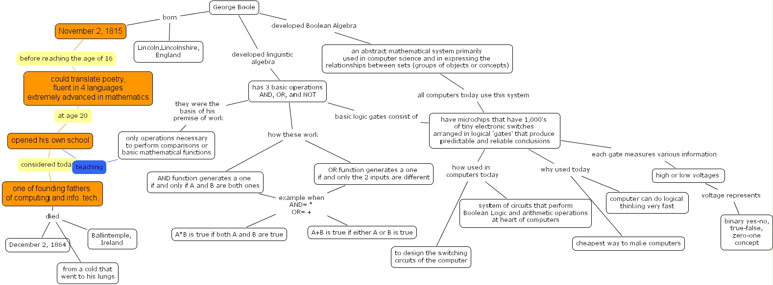 stringmapsolution8, a b is true if both a and b are true, high or low voltages , one of founding fathers of computing and info. tech., cheapest way to make computers, have microchips that have 1,000's of tiny electronic switches arranged in logical 'gates' that produce predictable and reliable conclusions, ballintemple, ireland, from a cold that went to his lungs, system of circuits that perform boolean logic and arithmetic operations at heart of computers, only operations necessary to perform comparisons or basic mathematical functions, opened his own school, to design the switching circuits of the computer, an abstract mathematical system primarily used in computer science and in expressing the relationships between sets (groups of objects or concepts), has 3 basic operations and, or, and not, could translate poetry, fluent in 4 languages extremely advanced in mathematics, george boole, binary yes-no, true-false, zero-one concept, december 2, 1864, or function generates a one if and only the 2 inputs are different, november 2, 1815, a b is true if either a or b is true, computer can do logical thinking very fast, and function generates a one if and only if a and b are both ones, lincoln,lincolnshire, england