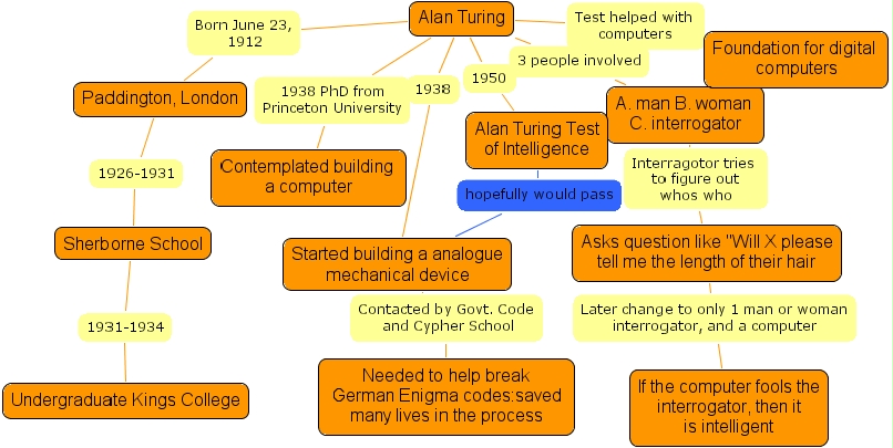 treesolution22, a. man b. woman c. interrogator, paddington, london, undergraduate kings college, sherborne school, alan turing, asks question like will x please tell me the length of their hair, contemplated building a computer, if the computer fools the interrogator, then it is intelligent, started building a analogue mechanical device, needed to help break german enigma codes saved many lives in the process, alan turing test of intelligence, foundation for digital computers