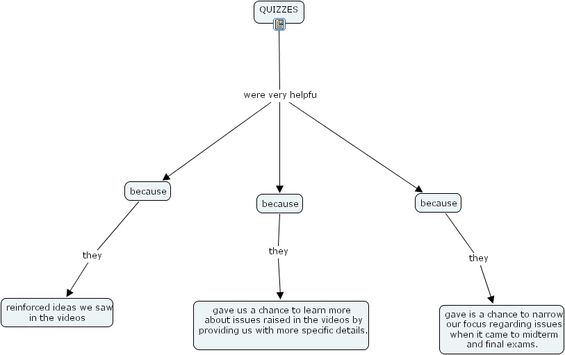quizzes, quizzes, because, gave is a chance to narrow our focus regarding issues when it came to midterm and final exams., reinforced ideas we saw in the videos, gave us a chance to learn more about issues raised in the videos by providing us with more specific details. , because, because