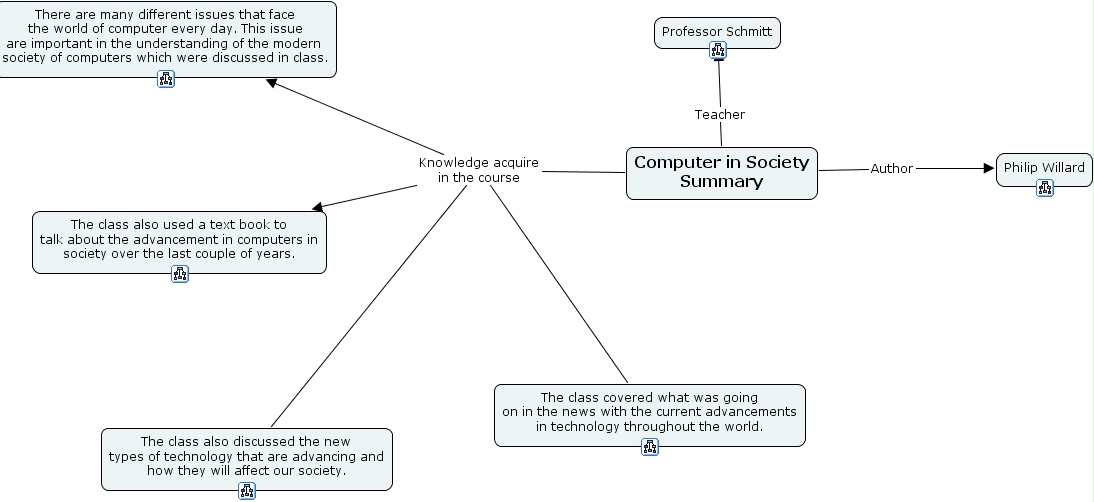 summary, the class covered what was going on in the news with the current advancements in technology throughout the world., philip willard, computer in society summary, the class also discussed the new types of technology that are advancing and how they will affect our society., the class also used a text book to talk about the advancement in computers in society over the last couple of years., professor schmitt, there are many different issues that face the world of computer every day. this issue are important in the understanding of the modern society of computers which were discussed in class.