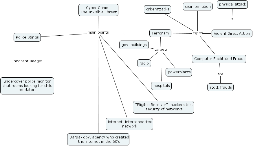 video cmap, cyberattacks, computer facilitated frauds, radio, internet- interconnected network, hospitals, eligible receiver - hackers test security of networks, darpa- gov. agency who created the internet in the 60's, physical attack, cyber crime- the invisible threat, disinformation, police stings, gov. buildings, undercover police monitor chat rooms looking for child predators, stock frauds, terrorism, powerplants, violent direct action