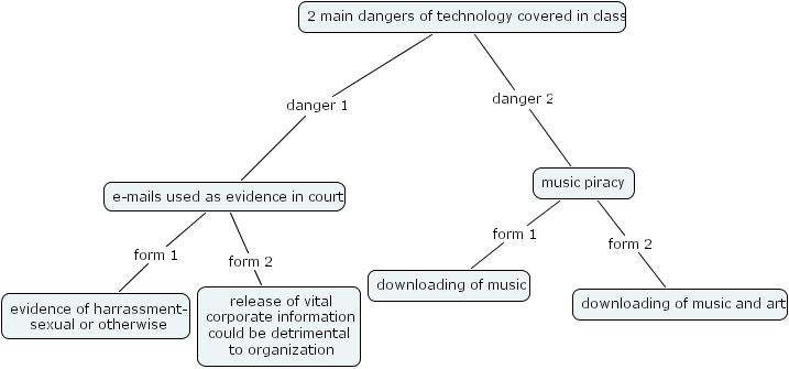 danger2, e-mails used as evidence in court, 2 main dangers of technology covered in class, downloading of music and art, music piracy, release of vital corporate information could be detrimental to organization, downloading of music, evidence of harrassment- sexual or otherwise