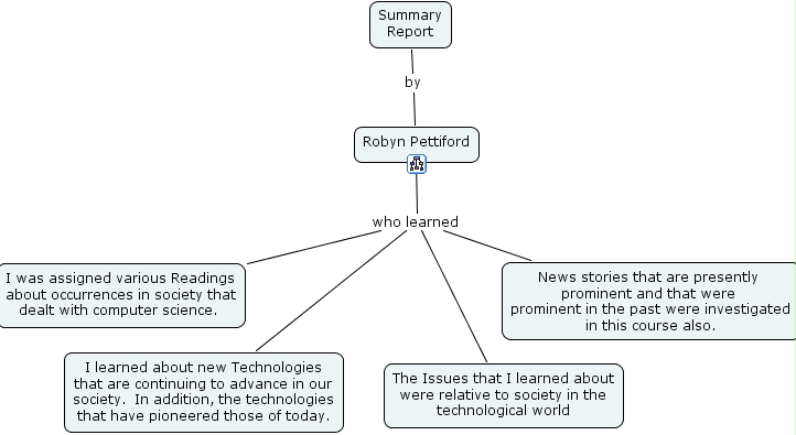 forum 5, the issues that i learned about were relative to society in the technological world, i learned about new technologies that are continuing to advance in our society. in addition, the technologies that have pioneered those of today., i was assigned various readings about occurrences in society that dealt with computer science. , news stories that are presently prominent and that were prominent in the past were investigated in this course also., robyn pettiford, summary report