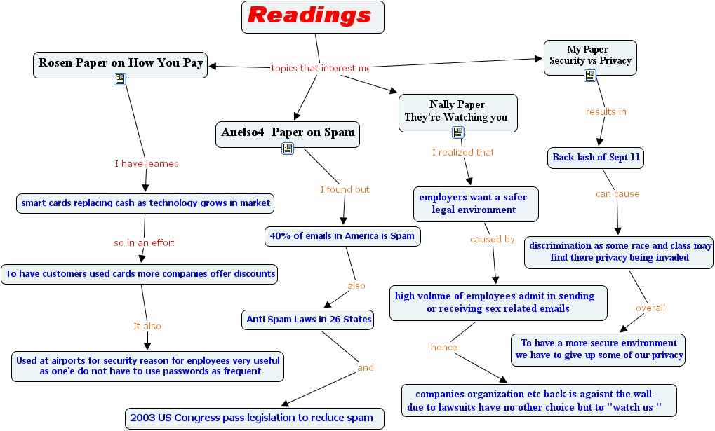readings, nally paper they're watching you, anelso4 paper on spam, readings, discrimination as some race and class may find there privacy being invaded , companies organization etc back is agaisnt the wall due to lawsuits have no other choice but to watch us , high volume of employees admit in sending or receiving sex related emails, employers want a safer legal environment, anti spam laws in 26 states, 40% of emails in america is spam, to have customers used cards more companies offer discounts, to have a more secure environment we have to give up some of our privacy, back lash of sept 11, my paper security vs privacy, 2003 us congress pass legislation to reduce spam, used at airports for security reason for enployees very useful as one'e do not have to use passwords as frequent, smart cards replacing cash as technology grows in market, rosen paper on how you pay