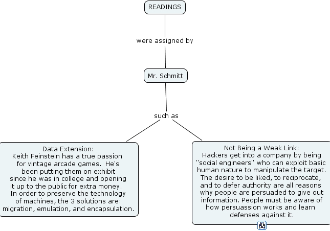 summary readings, data extension keith feinstein has a true passion for vintage arcade games. he's been putting them on exhibit since he was in college and opening it up to the public for extra money. in order to preserve the technology of machines, the 3 solutions are migration, emulation, and encapsulation., not being a weak link hackers get into a company by being social engineers who can exploit basic human nature to manipulate the target. the desire to be liked, to reciprocate, and to defer authority are all reasons why people are persuaded to give out information. people must be aware of how persuassion works and learn defenses against it., readings, mr. schmitt