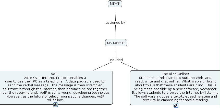 news summary, news, the blind online students in india can now surf the web, and read, write and chat online. what is so significant about this is that these students are blind. this is being made possible by a new software, vachantar. it allows students to browse the internet by listening. the software includes a text-to-speech system and text-braille embossing for tactile reading., mr. schmitt, voip voice over internet protocol enables a user to use their pc as a telephone. a data packet is used to send the verbal message. the message is then scrambled as it travels through the internet, then becomes peiced together near the receiving end. voip is still a young, developing technology. however, as the future of telecommunications changes, voip will follow.