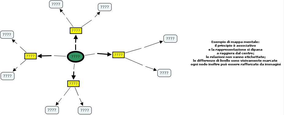 esempio vuoto di mappa mentale, ????, ????, ????, ????, ????, ????, ????, ????, esempio di mappa mentale il principio � associativo e la rappresentazione si dipana a raggiera dal centro le relazioni non vanno etichettate le differenze di livello sono visivamente marcate ogni nodo inoltre pu� essere rafforzato da immagini, ????, ????, ????, ????, ????
