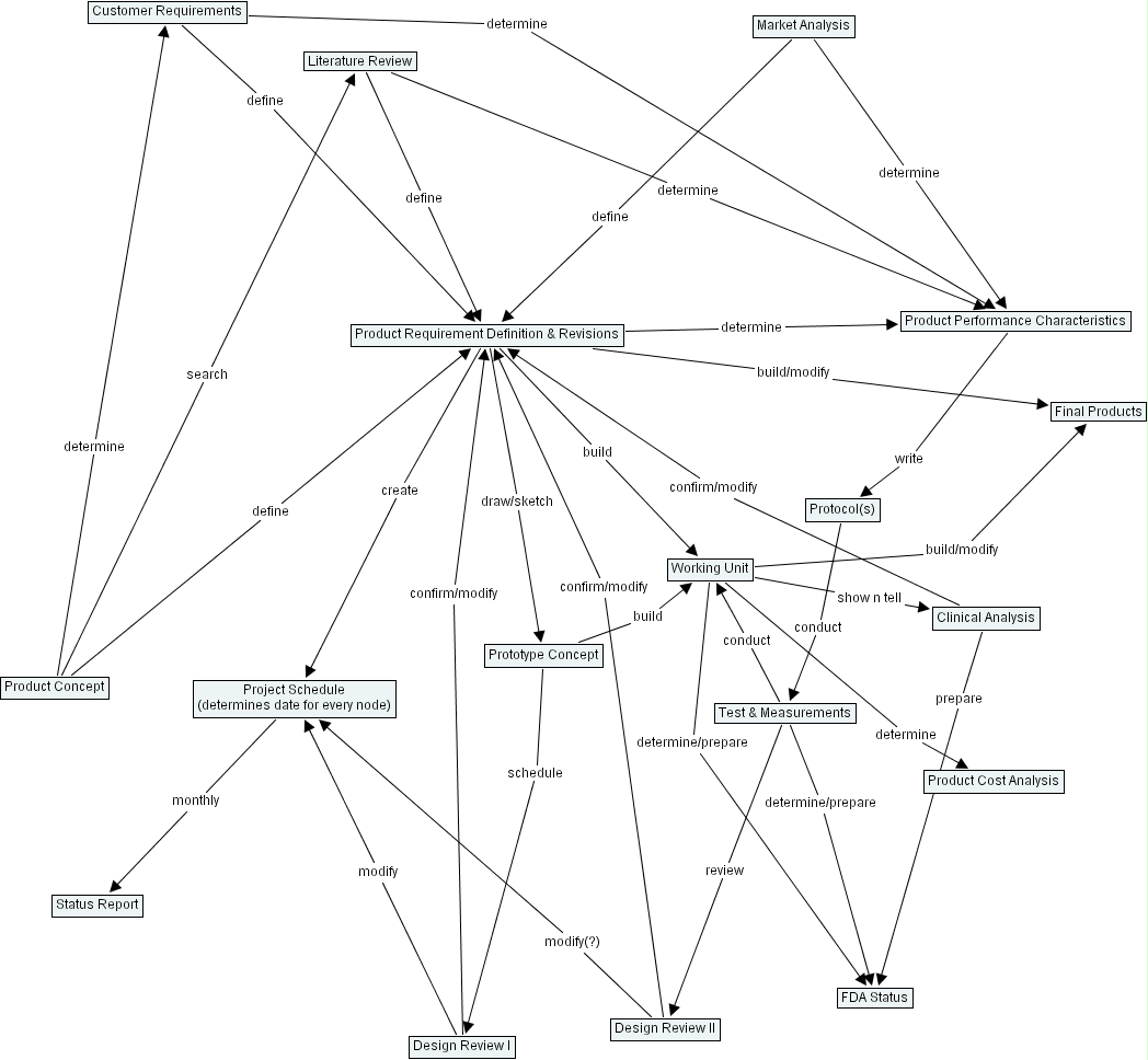 layton concept map, product requirement definition & revisions, customer requirements, design review i, project schedule (determines date for every node), design review ii, product performance characteristics, clinical analysis, final products, fda status, test & measurements, working unit, prototype concept, product cost analysis, protocol(s), market analysis, status report, product concept, literature review