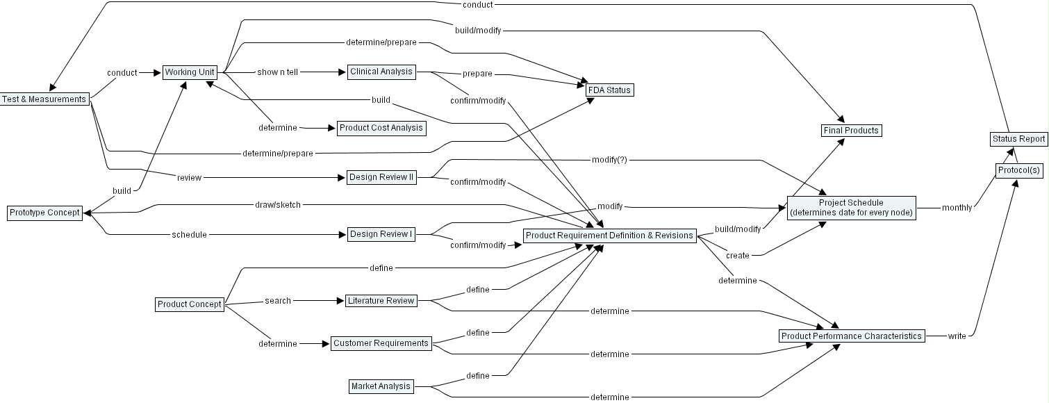 layton concept map (hierarchical format), product requirement definition & revisions, customer requirements, design review i, project schedule (determines date for every node), design review ii, product performance characteristics, clinical analysis, final products, fda status, test & measurements, working unit, prototype concept, product cost analysis, protocol(s), market analysis, status report, product concept, literature review