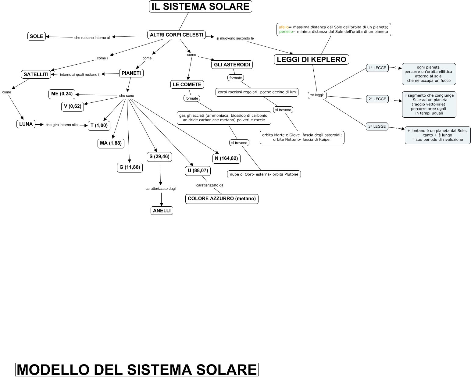 Questa Cmap, creata con IHMC CmapTools, contiene informazioni relative a: Sistema_Solare, PIANETI che sono MA (1,88), ALTRI CORPI CELESTI come i PIANETI, 1° LEGGE : ogni pianeta percorre un'orbita ellittica attorno al sole che ne occupa un fuoco, ALTRI CORPI CELESTI come GLI ASTEROIDI, PIANETI che sono T (1,00), gas ghiacciati (ammoniaca, biossido di carbonio, anidride carbonicae metano) polveri e roccie si trovano nube di Oort- esterna- orbita Plutone, LEGGI DI KEPLERO tre leggi: 2° LEGGE, GLI ASTEROIDI formate corpi rocciosi regolari- poche decine di km, LE COMETE formate gas ghiacciati (ammoniaca, biossido di carbonio, anidride carbonicae metano) polveri e roccie, PIANETI che sono V (0,62), ALTRI CORPI CELESTI come LE COMETE, ALTRI CORPI CELESTI si muovono secondo le LEGGI DI KEPLERO, 2° LEGGE : il segmento che congiunge il Sole ad un pianeta (raggio vettoriale) percorre aree ugali in tempi uguali, SATELLITI come LUNA, PIANETI che sono G (11,86), PIANETI che sono ME (0,24), PIANETI che sono S (29,46), LUNA che gira intorno alla T (1,00), S (29,46) caratterizzato dagli ANELLI, LEGGI DI KEPLERO tre leggi: 1° LEGGE