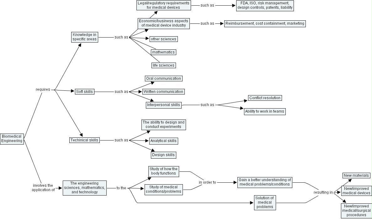 goldberg map2 (hierarchical format), new materials, biomedical engineering, the engineering sciences, mathematics, and technology, other sciences, solution of medical problems, techinical skills, soft skills, legal regulatory requirements for medical devices, ability to work in teams, life sciences, study of medical conditions problems, new improved medical surgical procedures, design skills, written communication, conflict resolution, the ability to design and conduct experiments, knowledge in specific areas, economic business aspects of medical device industry, oral communication, new improved medical devices, reimbursement, cost containment, marketing, fda, iso, risk management, design controls, patents, liability, gain a better understanding of medical problems conditions, study of how the body functions, interpersonal skills, mathematics, analytical skills