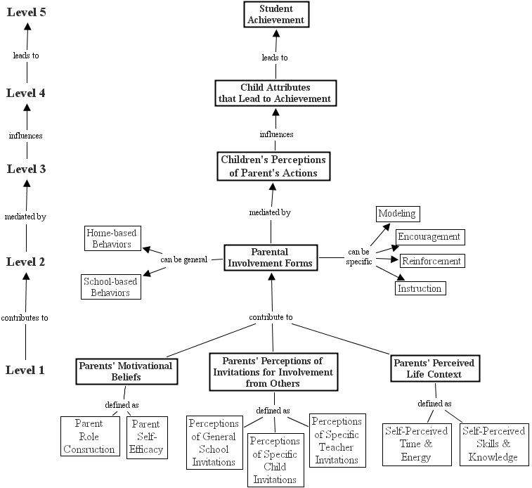 hds model revised full dec 03, level 3, parent self- efficacy, school-based behaviors, self-perceived time & energy, reinforcement, child attributes that lead to achievement, parents' perceptions of invitations for involvement from others, perceptions of specific teacher invitations, home-based behaviors, perceptions of specific child invitations, parental involvement forms, level 1, self-perceived skills & knowledge , modeling, instruction, parent role consruction, parents' motivational beliefs, level 2, level 5, children's perceptions of parent's actions, encouragement, level 4, perceptions of general school invitations, student achievement, parents' perceived life context