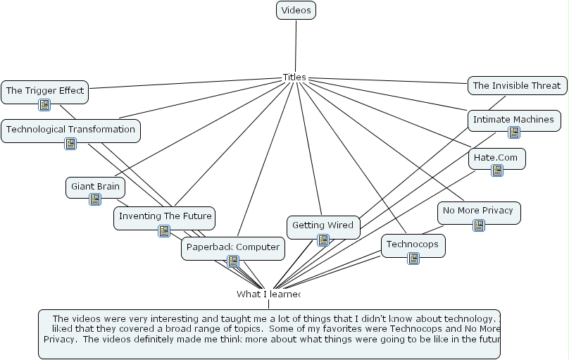 videos, inventing the future, the invisible threat , the videos were very interesting and taught me a lot of things that i didn't know about technology. i liked that they covered a broad range of topics. some of my favorites were technocops and no more privacy. the videos definitely made me think more about what things were going to be like in the future. , the trigger effect, getting wired , no more privacy , intimate machines , technocops , technological transformation , videos, giant brain, hate.com , paperback computer