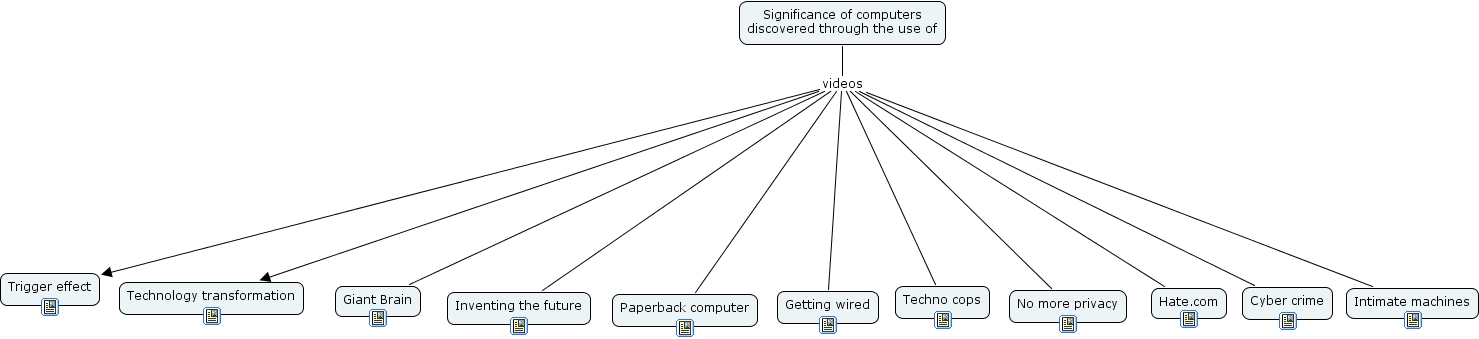 videos, paperback computer, techno cops, trigger effect, giant brain, hate.com, intimate machines, cyber crime, no more privacy, technology transformation, inventing the future, significance of computers discovered through the use of, getting wired
