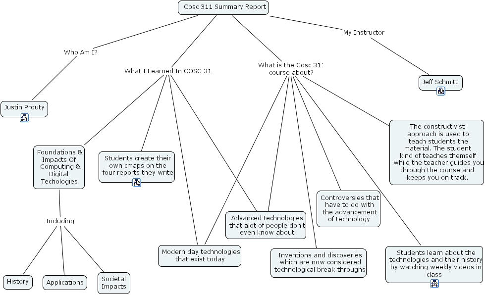 summary report cmap, the constructivist approach is used to teach students the material. the student kind of teaches themself while the teacher guides you through the course and keeps you on track., students create their own cmaps on the four reports they write, history, inventions and discoveries which are now considered technological break-throughs, societal impacts, justin prouty, students learn about the technologies and their history by watching weekly videos in class, cosc 311 summary report, foundations & impacts of computing & digital techologies, controversies that have to do with the advancement of technology, modern day technologies that exist today, advanced technologies that alot of people don't even know about, jeff schmitt, applications