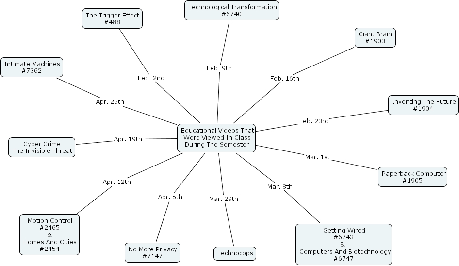 videos cmap, the trigger effect 488, technocops, getting wired 6743 & computers and biotechnology 6747, giant brain 1903, inventing the future 1904, intimate machines 7362, no more privacy 7147, motion control 2465 & homes and cities 2454, technological transformation 6740, cyber crime the invisible threat, educational videos that were viewed in class during the semester, paperback computer 1905