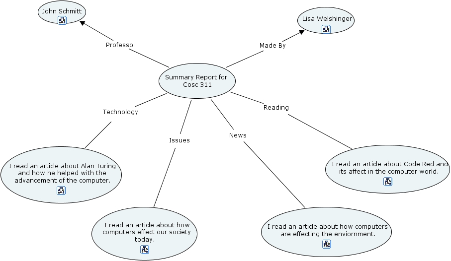 summary, lisa welshinger, i read an article about how computers are effecting the enviornment., i read an article about how computers effect our society today., i read an article about alan turing and how he helped with the advancement of the computer., i read an article about code red and its affect in the computer world., john schmitt, summary report for cosc 311
